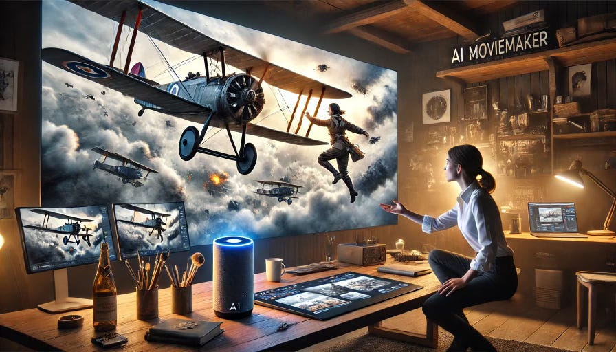 * Image Prompt: "Create a photorealistic image of a female human artist sitting at a table talking with a smart speaker that has the words "AI Moviemaker" visible on it. They are talking about a creative project that the two are making together. Above the human and the smart speaker is a wide television screen where an exciting scene of an action movie set during WWI takes place. In the scene, two Neiuport 10 airplanes are flying parallel to each other. A woman dressed in military gear is leaping from the wing of one Nieuport 10 airplane to the other Nieuport 10 airplane." After ChatGPT created an initial image, it suggested a couple of refinements that I accepted, which resulted in the image above. One surprising thing about the image is that ChatGPT spelled "AI Moviemaker" correctly.