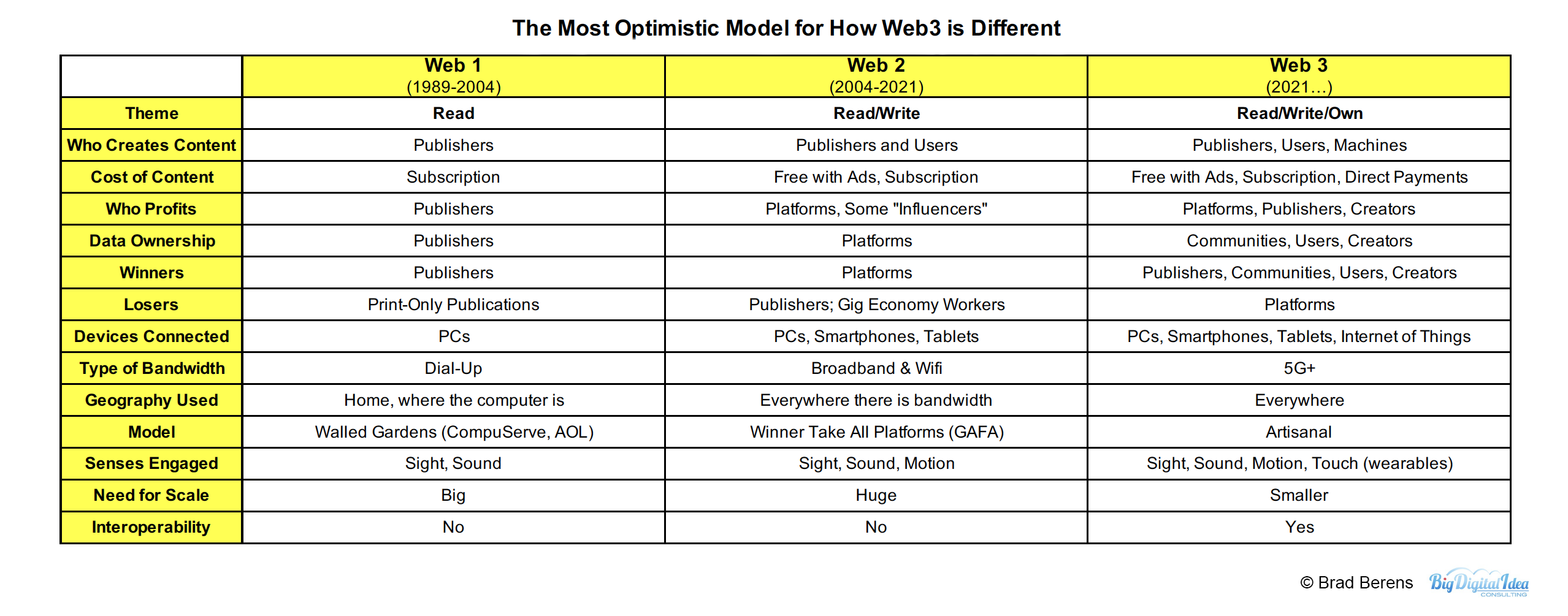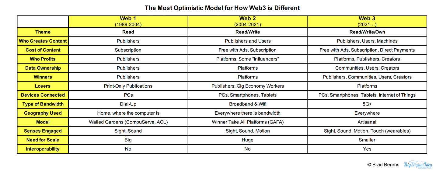 Note: for a pessimistic model, check out the terrific work of Molly White, who runs Web3 Is Going Just Great. Her site details the grift, abuse, fraud, and exploitation happening in Web3 platforms. HBR just profiled her in this illuminating interview.