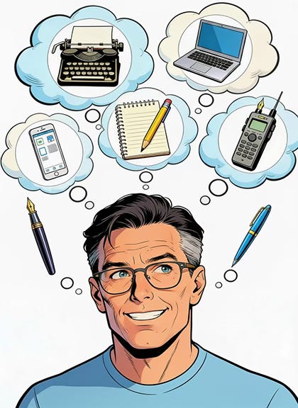 * Image Prompt: I started with, “Please create this image: A comic book style illustration with a middle-aged white guy with gray temples and dark hair, wearing glasses. He has a contemplative look on his face. Thought clouds (like in comic books) surround him, each thought cloud contains a different writing tool: a typewriter, a laptop, a pencil, a ballpoint pen, a notebook, a fountain pen, a dictaphone, and anything else you can think of.” I then iterated with the AI for two rounds before getting the above result. ChatGPT never quite got the images right. Gemini did a nice job, but the result included a caption, “The Writer’s Mind,” that I didn’t ask for and didn’t like.
